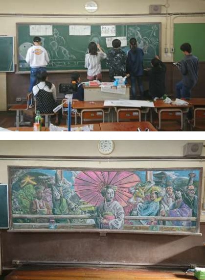 ・京都市選挙管理委員会の依頼を受けて、制作したいという生徒有志が2019年「京都市議会議員・府議会議員選挙啓発」のための黒板アート作品を完成させました。どのような絵にするか時間を空けて構想し、下絵を描き、本校の教室の黒板に3日間かけて丁寧に制作しました。カメラマンによって撮影された作品は、縦2.5m、横10mの巨大な大型壁面シートになって迫力ある啓発シートとなりました。選挙まで京都市役所の正面に掲示されました。