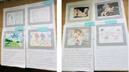 夏休み明けに授業を再開して最初の授業で,クラス全員の作品を鑑賞し,互いにコメントを寄せ合いました。新型コロナウィルス感染症への対応で,例年に比べてたいへん短く,外出や活動に制限がある夏休みでしたが,それぞれの夏の思い出を共有することができました。