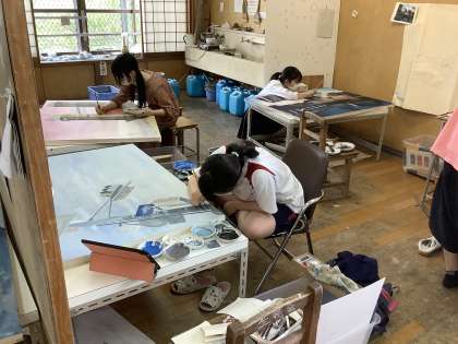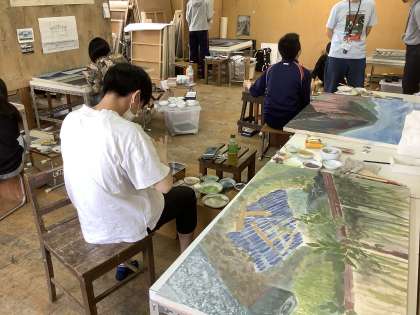 3年生では,2年次後期から写生をはじめ,本紙制作に取り組んでいた風景画の仕上をしています。