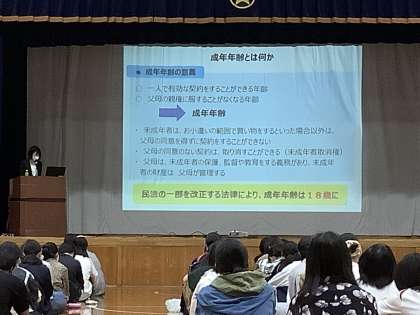 成年年齢とは、「一人で契約をすることができる年齢」「父母の親権に服さなくなる年齢」という意味であることをとりあげ、契約に関する知識を学び、様々なルールを知った上で、その契約が必要かよく検討する力を身につけておくことが重要になるとの内容でした。