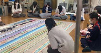染織専攻では,3年生の帯制作の合評に2年生も参加しました。3年生は制作テーマやプロセスについて丁寧に説明し,2年生は1年後の自分の姿をイメージしながら,熱心に記録を取っていました。真摯にものづくりに向き合い,絶えずつきまとう迷いや失敗にどのように対処し乗り越えているかについて,専門的な技術や意図を交え一所懸命に言葉にして伝えようとしている3年生はとても美しかったです。学年を越えて一緒に学ぶことで,対話が生まれ,学びが深まっていることがひしひしと伝わってきました。