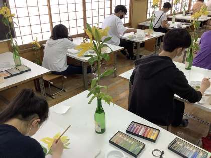 日本画専攻では,水干(すいひ)絵の具によるスカシユリの制作を行っています。