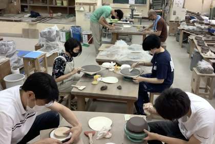 午前中,学校の陶芸専攻実習室に生徒12名,教職員2名が集い,陶芸専攻の指導教員の下,販売するお皿を次々に作製しました。