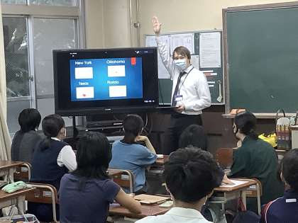 来ていただいた初日の1時間目から、3年生の「コミュニケーション英語」の授業をしてくださいました。たくさんの写真をタブレットで使って先生ご自身の紹介をしていただいた後、グループワークを交えながら生徒からの質問を受けてくださり、生徒たちは早速英語を楽しみながら活用していました。