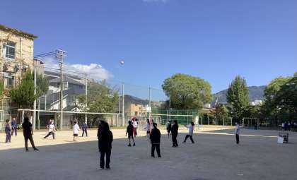 10月の清々しい秋晴れの中、グラウンドでは1年生が体育の授業でバレーボーを行い、汗を流していました。