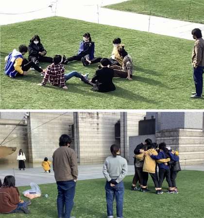 生徒たちは初めての現代美術の考え方に悪戦苦闘しながら,必死に考えていました。体を動かして考えたほうがいいのでは,という二藤先生の助言で,中庭に出て体を動かしながら試行錯誤していました。