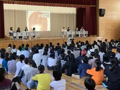 体育館に全校生徒が集まり、新旧の生徒会役員の挨拶に続き、文化祭や体育祭についてや新入生歓迎会の総括が提示されました。あわせて、生徒会のボランティア活動の報告と生徒会執行部サポートメンバー募集のお知らせもあり、盛りだくさんの内容でした。