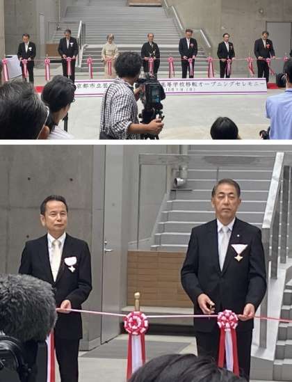 本校からは、教職員を代表して、校長・副校長・教頭・事務長の4名と、生徒を代表して生徒会執行部の3名が出席させていただきました。テープカットの後、本校生徒に門川大作京都市長から温かい言葉をかけていただきました。