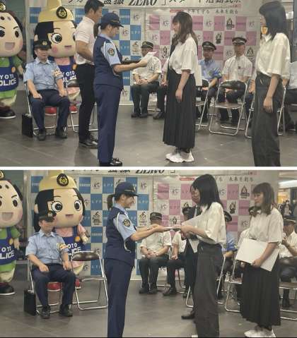 この度そのポスターが完成し、先週7日(土)、地下鉄京都駅「コトチカ広場」において、「ちかん・盗撮 ZERO」活動のスタート式が行われ、鉄道警察隊から学校とポスターを制作した生徒たちに感謝状が贈られました。スタート式の最後は、広報啓発物の配布があり、参加した校長と2名の生徒は、地下街を行きかう方に声をかけながら配布を行いました。