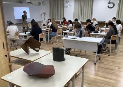 1年生の表現基礎 l 授業では、紙を素材に立体作品制作の課題を行う前に、本校が所蔵している彫刻分野や陶芸分野の抽象的な作品を鑑賞する授業を行いました。