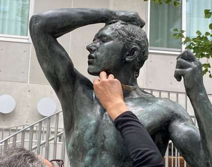 22日(火)、本校中庭に設置しているブロンズ像(青銅時代)のクリーニングを、専門の方に来ていただき行いました。