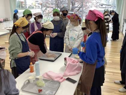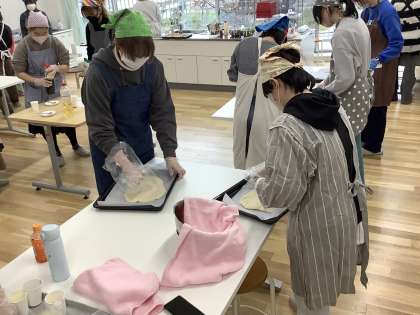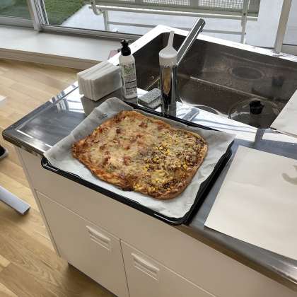 テリヤキチキンとソーセージの2種類の具材を中心にしたピザです。生地をこねて発酵させ、焼き上げるところまで、各グループで役割分担しながら手際よく調理をしていました。