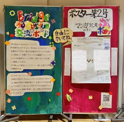 今回その第2弾として、生徒昇降口前のピロティに、写真のようなボードを設置、昨年度派遣生がBAA(ボストンアーツアカデミーの略)で見てきたマンガ対決を本校でもやってみようという企画です。BAAでは日本の漫画が大変人気で、生徒間で投票が行われています。