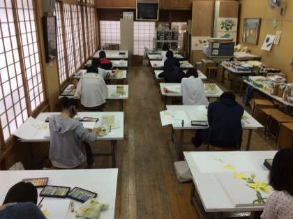 1年生の「造形表現」の授業では、4月から日本画・洋画・彫刻・漆芸・陶芸・染織・デザイン・ファッションアートの8分野の実習を順に全て学んだあと、6月から各自が希望した3分野の実習を行い、10月中旬の後期から2分野並行に学びます。