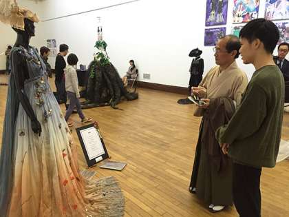 最終日の午後、門川京都市長が公務ご多忙な中ご来場いただき、生徒の作品を観ていただくとともに、受賞生徒とお話をしていただきました。市長は生徒の作品の素晴らしさを高く評価していただくとともに、制作した生徒の努力を褒め、さらなる成長に向けて励ましの言葉をいただきました。