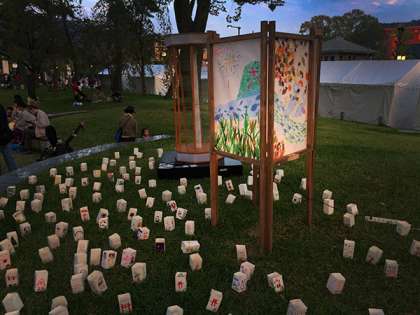 10月11日(日)第36回美工作品展の最終日、岡崎公園一帯で京都学生祭典が開催されました。本校は、この祭典とのコラボレーションとして、1年生が共同で制作した大型の行灯を展示しました。岡崎公園で子どもたちが牛乳パックを使った灯りを制作するイベント会場で、中心になるオブジェの一つとして作ったものです。