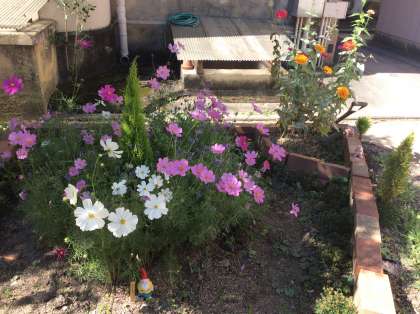 素晴らしい秋麗の朝 後期が始まりました。校庭の花壇はコスモスが満開です。夏季休暇中に園芸部が花壇の整備をして植えた花苗は、立派に花を咲かせて心を和ませてくれています。管理用務員さんのこまめな手入れのお蔭でもあります。