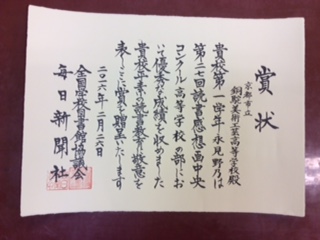 今回は、本校1年生の永見野乃さんが「優良賞」を受賞し、「学校賞」も受賞しました。授賞式は先日、東京で開かれました。