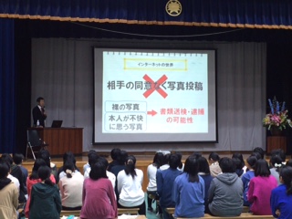 今日は1年生の「ケータイ教室」を実施しました。携帯電話、スマートフォンは多くの生徒がもうすでに所有していますが、使用にあたってのモラル、危険性をよく理解すること、しっかりした判断力を身に着けることを狙いとして、KDDIから講師をお招きして実施しました。