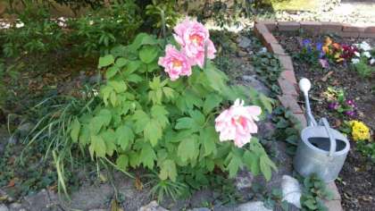 4月20日、校庭の花壇に、牡丹(ぼたん)の花が立派に咲いています。桜の季節が終わり、大きく開いた牡丹の花が、今、存在感を示しています。