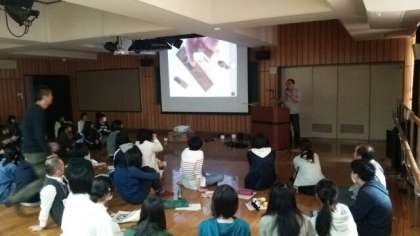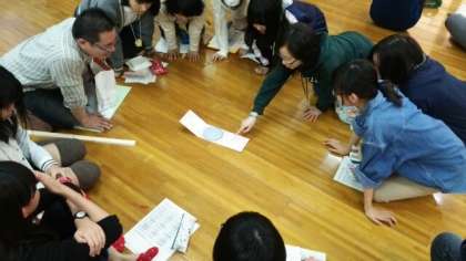 1回目の授業は、1年生全員がマルチホールに集まり、科目のガイダンスを受けました。8分野を順番に学習するのは、クラスを越えた11〜12名ほどの少人数講座です。最初にスタートする専門分野の担当教員とそのグループの生徒が輪になって、自分のお気に入り、大切にしている「モノ」を持ち寄って、発表と意見交換をしました。途中、担当する9名の教員の持ってきたお気に入りの「モノ」の紹介は、教員自身のこだわり、個性あふれる話し方がなかなか魅力的でした。今回の授業は、学習のオープニングとして、アクティブ・ラーニングの手法で、双方向的な言葉のやり取り、言葉で伝える、言葉を受け取る、理由をつけて説明することを学びました。