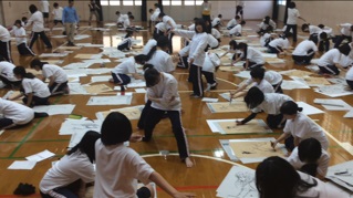 今日の授業は1年生90名全員が体育館に入っての授業でした。最初に「表現基礎1」の授業全体についてオリエンテーション。ラスコー洞くつの壁画を材料にとりあげ、当時の人がどんなふうにして、どんな思いで壁画を描いたのだろうか、という問いを投げかけました。アイスブレイクのあと、「向き合ってドローインク゛」(握手したあと一旦離れて交互に描く)、「型取りドローインク゛」(2名で身体の型取りをしたあと交互に描く)に取り組みました。身体の型取りでは、最初に教員が舞台上で見本を見せました。1年生全員が体育館で、身体を動かしながら取り組むドローイングは、教室で行う実習とは異なるモチベーション、展開となりましたが1年生は、楽しく熱心に取り組みました。描く活動だけでなく、授業の振り返りでは今日の学習を言語化して記録に残しました。