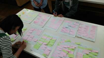 1回目の今日は、グループワークでブレインストーミング(BS)法用いて、自己の意見を出すこと、他者の意見を聴くこと、そしてKJ法により、出された意見をカテゴリーに分類してまとめることを学習しました。そのあと、「望ましいiPadの使い方のルール」を各グループで考えることを目指しました。教科書の内容を「講義」する形ではなく、アクティブ・ラーニングの方法で、提示した課題をみんなで考え合うという授業展開にしました。生徒は熱心に取り組んでいました。