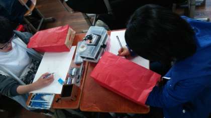 1回目、2回目の授業は、学年の生徒全員が体育館に入り、ダイナミックな授業を行いました。4月22日(金)3回目の授業は、各クラスごと教室で行われました。今回は「触れて観察する〜五感で描くドローイング」です。袋に入ったモチーフを「触る」ことによって観察し、描画するという学習です。「観察する」ことの幅を広げ、視覚に頼らず、身体・五感でで受け取った情報を言語で再確認し、さらにドローイングするという流れで授業を展開しました。