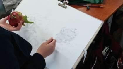 モチーフは2つ。1つ目の袋の中は、「ドラゴンフルーツ」。中を見ずに手で触りながら大きさ、かたち、硬さ、柔らかさ、質感などをとらえ、言葉にしてメモし、それをドローイングします。2つ目の袋の中は、「はなびらたけ」。これもモチーフを見ずに触った感触でドローイング。その後モチーフを袋から出して、感じ方や特徴などをグループで共有します。次の課題は、ドラゴンフルーツとはなびらたけのドローイング。実際に見て、触って、よく観察してドローイングします。