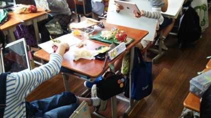 授業の最後に、生徒自身の“my iPad”登場。モチーフ、作品を学習の記録として画像に記録しておきます。授業のまとめは、ノートに記入。iPadを効果的に活用しつつ、手書きで文章を記入することも併用しています