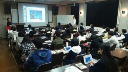 写真は、授業導入時の様子と、美術史の学習の様子です。教材を中央の画面にも提示していますが、各自の“my iPad”にも配信されており、拡大して細かく部分を鑑賞することもできます。各自の学習とグループワークとを組み合わせて授業は進行します。