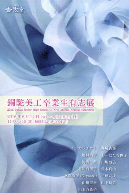 第23回の「銅駝美工卒業生有志展」が6月14日〜19日まで、ギャラリー吉象堂で開催されていました。今回は13名の卒業生の作品が展示され、たっぷり鑑賞させていただきました。卒業後様々な分野で活躍しながら、現在も制作者、表現者として活動されていることはたいへん素晴らしいことであり、後輩の憧れでもあります。今後もご活躍を期待しております。