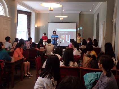 本日はCambridge大学に向かいました。現役のCambridge大学生にガイドをしてもらい、午前中は街を散策しました。Cambridgeの歴史溢れる様々な場所を訪れ、説明を聞いたり写真を撮ったり質問をしたりと有意義に過ごしていました。午後からは大学生とのセッションがありました。説得力のあるスピーチ及びライティングの為のポイントを様々な例を踏まえながら学び、実際にそれらを用いてペアやグループでディスカッションを行いました。少し難しいところもありましたが、グループ内でわかった事を共有し協力しながら学ぶ事が出来ました。