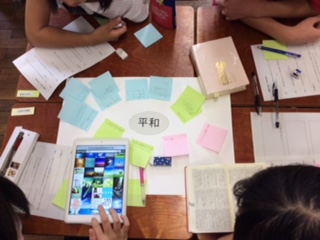 グループごとにキーワード(友達、猫、平和、希望)について、画像を探し、自分たちだけの意味を考えた辞典を作成して、発表しました。