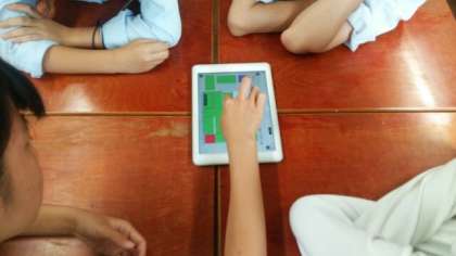 グループごとに、Fingerbordというアプリケーションを使いながら、条件の付けられた升目にタイルを敷き詰めるゲームをして隠された規則性を探すということにチャレンジましたした。