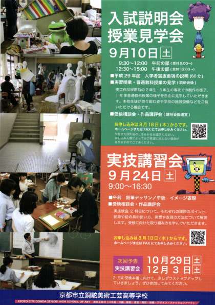 平成29年度銅駝美術工芸高等学校入学者選抜に関して説明をさせていただくとともに、2・3年生の専攻実習授業、1年生の授業を見学していただけます。また受検に関する相談や持参作品の講評も行いますので、ぜひご参加ください。午前の部と午後の部は同じ内容です。ご都合の良い方にお申込みください。1・2年生の方も是非ご参加ください。