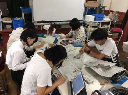「新幹線ニュース」とは、東海道新幹線走行時に客室内の電光掲示装置に流れる短い文章にまとめられたテキストニュースのことです。普段、情報を入手する手段として「インターネット」がよく利用されていますが、今回は「新聞」を教材にして授業を進めました。