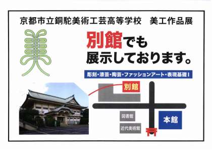 京都市美術館の本館2F北側で、日本画・洋画・染織・デザイン専攻、別館1F2Fで、陶芸、彫刻、漆芸、ファッションアート専攻、1年生「表現基礎」作品を展示しています。1年生から3年生までの全生徒の作品、あわせて797点。多くの皆様にご観覧いただきたく、ご来場をお待ちしております。