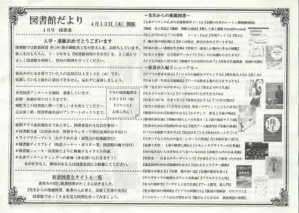 新学期になってすでに「図書館だより」「図書館利用の手引き」が発行されています。どんどん利用してほしいと思います。