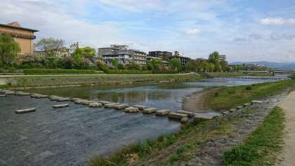 「賀茂川」と「高野川」が合流する出町柳付近から下流を「鴨川」と表記しますが、「かもがわ」の飛び石はよく知られているのが4つ。(本当は5つあって西賀茂橋の北に水没しかけのものがあるそうです)。1つ目は、北大路橋の北、「賀茂川」の府立植物園付近に、2つ目は出町柳の合流地点、3つ目は荒神橋の北、そして4つ目が二条大橋の北、わが銅駝美術工芸高校の実習棟の東に見える飛び石です。