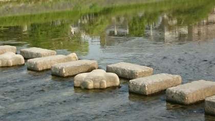 この飛び石は、左右にずらして石が置かれているので、単純にまっすぐ渡って進むことはできません。石と石の間は意外と幅があり、普通の歩幅で跨(また)げる感じではなく少し負荷がかかります。さらに石と石の間の水の流れは思っていたよりも速く感じます。石から石へさらりとかっこよく渡ることにこだわる私は、足元を見ながら、普通の歩幅よりちょっと広げる踏ん張りで渡っています。今のところ川にはまって濡れた姿で出勤、という失態は見せていませんが、少し緊張感をもたないと、はまってしまうかもしれません。のんびり歩くようには渡れないという少々の負荷、ささやかな踏ん張りと緊張感、耳に届く川のせせらぎ、頬にあたる川の風。この1分少々の時間がなんとも爽快で、よくぞ勤務先の間近にこの石を置いていただいたものだと感謝しています。(もちろん皆さんに渡ることを推奨しているわけではありません、念のため)