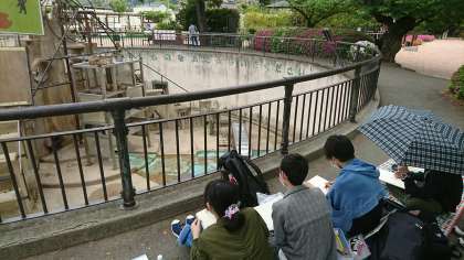 午後は、京都市動物園で昼食をとった後、写生に取り組みました。小雨模様でしたが各自、思い思いの動物の前に行き、観察をして描いていました。
