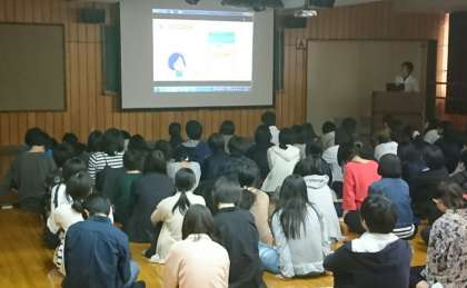 最初、2年生全員が、各自のiPadを持参し、マルチホールに集まりました。進路指導主事が、iPadやスマートフォンの活用により、自分の模擬試験データについて弱点を把握し次への課題など事後学習に役立てられることを説明しました。