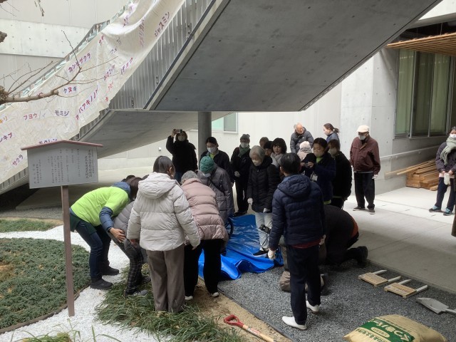地域の歴史を新たに見守ってくれるよう地面に戻される植物に向けて、実行委員会の方からは、「約束した里帰りが実現して気持ちもひとしおです。少しでも多くの方に土入れ作業に関わって頂き、思いが繋がるようご協力ください」と感慨深げに案内されていました。