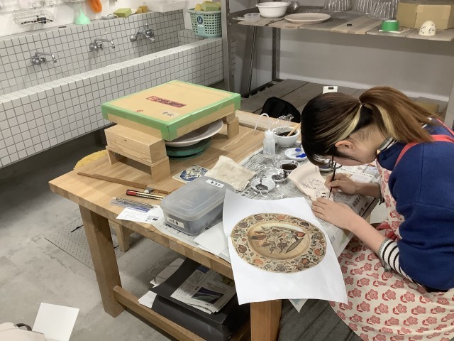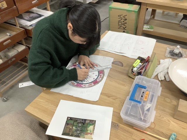 絵付けでは、それぞれがときめいた古陶磁の絵柄を模写していきますが、平面図とは違って皿のカーブに沿って正確に模写する必要があるため、グリッド線を引いて定規や分度器も駆使して、同じ比率になるよう緻密に計算している様子がとても印象的でした。また線の太さや流れ、構図や余白を丁寧に観察し、濃淡も意識して描きますが、やはり段差やカーブでの力加減がとても難しいと試し描きもしながら慎重に筆を運んでいました。