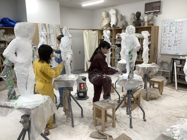 彫刻実習では、人物の骨格や筋肉の量、質、力、機能等を知り、粘土原型から石膏型を取り、最終的に樹脂作品へと仕上げる制作に取り組んでいました。