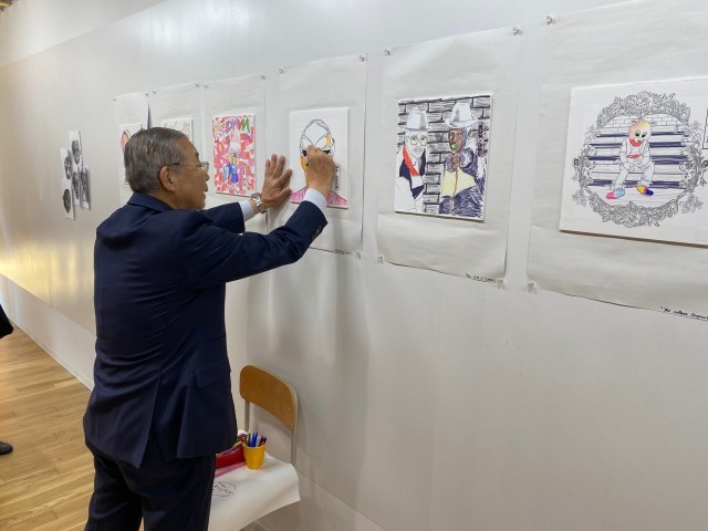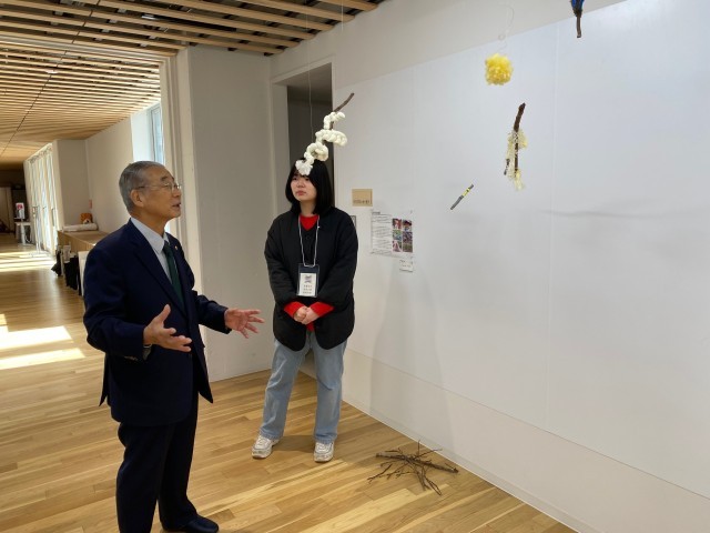 作品一つずつ丁寧にご観覧いただき、会場にいた生徒へ励ましの温かい言葉をかけてくださいました。観覧者参加型の作品にも加筆いただき、作品の完成度を高めていただきました。お忙しい中、本当にありがとうございました。