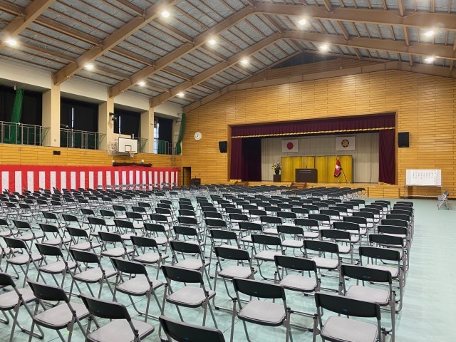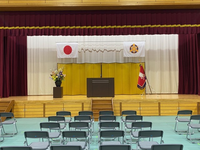 4月8日(水)、午前中に入学式、午後には離着任式・始業式・対面式を行います。本日(4/7)、会場となる京都市立芸術大学・美術工芸高校体育館の準備が整いました。
