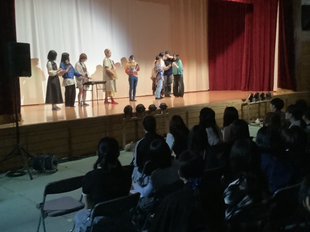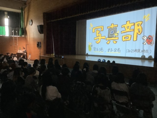 4月13日、令和8年度新入生に向けて、在校生による歓迎会が実施され、生徒会執行部の「盛り上がって行きましょう!」の掛け声のもと「オォ~!」という大歓声で始まりました。「新入生の皆さん、ご入学おめでとうございます」との挨拶のあと、各クラブの成果発表や文化祭等での活動内容、魅力や特色が具体的にイメージできるようそれぞれ工夫を凝らして紹介していました。