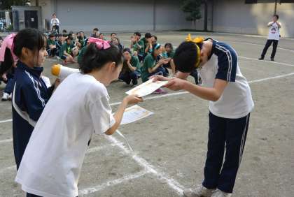 写真は左から、専攻別借り物競走ー学年対抗リレーー閉会式賞状授与 の様子